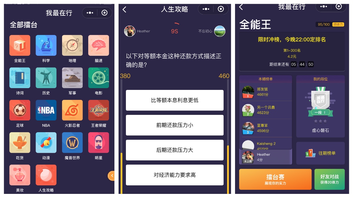 现已开端撒币,不过姿态有点不同,它发布了一款常识对战的微信小程序“我最内行”。这个小程序有全能王、科学、动漫、美妆等近二十个擂台。用户挑选擂台之后,会随机与另一名玩家对战,答题能够得分,每个擂台每天定排名,排名300名每个玩家能够取得奖金。