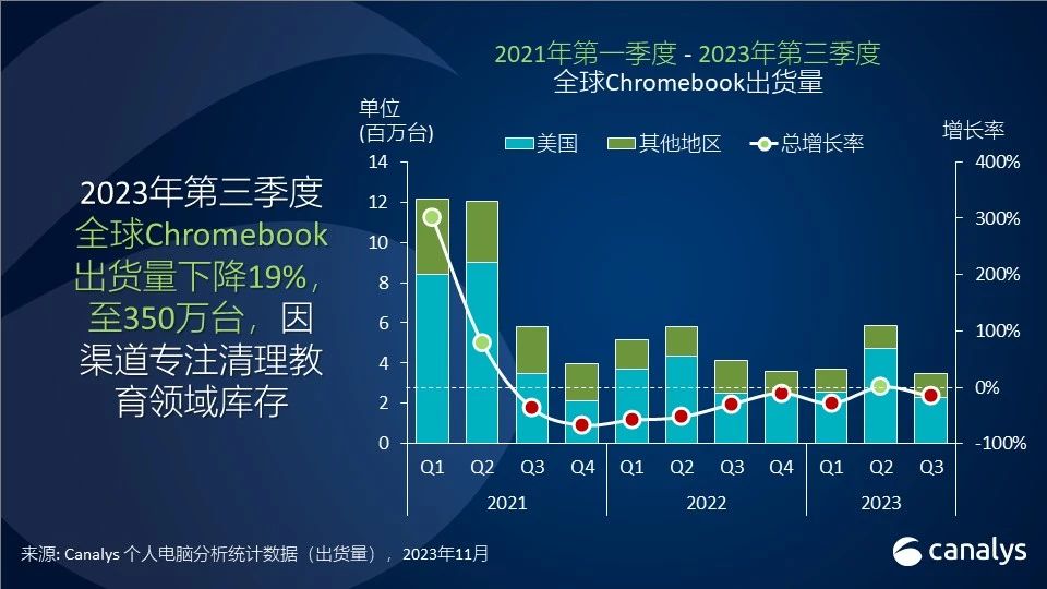 Canalys分析师Kieren Jessop表明,“因为此前美国商场对教育需求微弱,Chromebook在2023年第三季度的增加轨道发生晦气的影响,出货量环比下降40%。在本年的早些时候,OEM赶在ChromeOS授权费上调前预先出产各类Chromebook机型,以使用美国政府最终一轮的紧迫网络接入补助(Emergency Connectivity Fund)。但结果是,堆集的途径库存现在现已被铲除,但一起厂商Chromebook的出货呈现了下滑。”