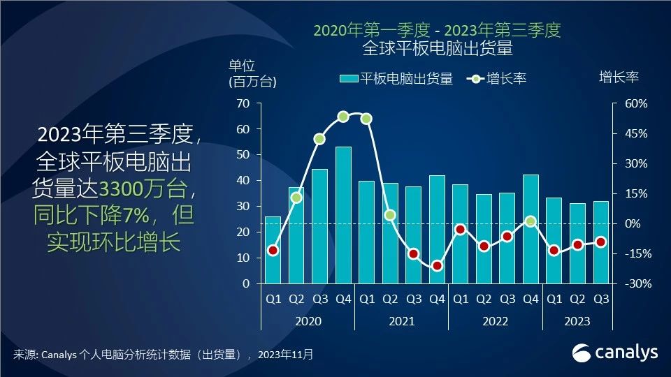 依据Canalys发布的数据,2023年第三季度,全球平板电脑出货量达3300万台,同比跌落7%,但环比添加8%,这反映出在重要的节日季前,平板电脑商场呈现复苏痕迹,新进者在该范畴也体现微弱。与此一起,途径在返校季进行库存整理,因而Chromebook在2023年第三季度的出货量跌落19%至350万台。